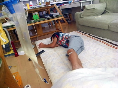 固形物はおろか、水分も受け付けないので、 昼も栄養剤の持続注入。 |