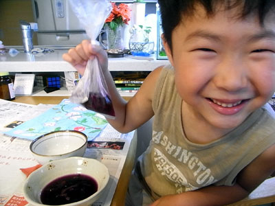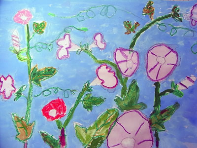 朝顔の色水で描いた花だが、色が薄く再度挑戦。