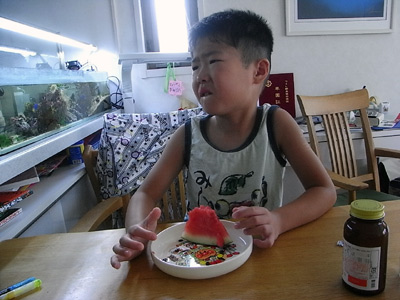 自分から、 おおきいの、たべる! と豪語するワリに、 一口食べただけで泣き言を。 |