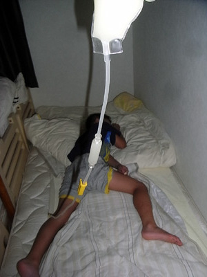 滴下スピードを測るチャンバー、 天地逆になり、空気が先端に送られてしまった。 こうなると、一度外して液を戻すなりナンなりしないと、 滴下してるかどうかもわからない。 自然滴下では栄養剤パックを低く設置する。 寝相が悪くて引っ張ると、こういうことがしばしば起こる。 |
