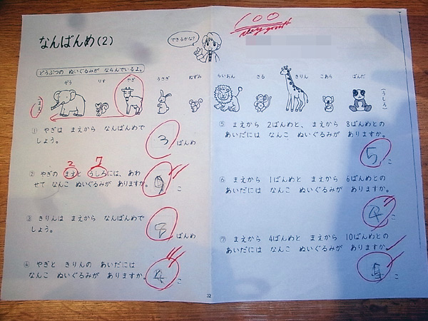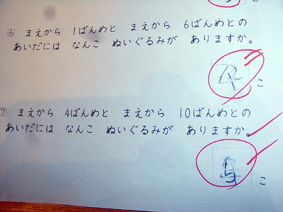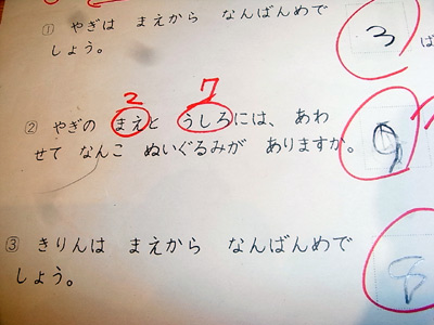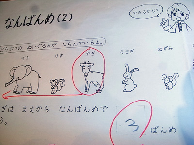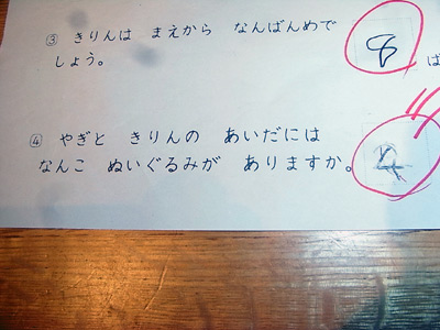 動物のぬいぐるみが並んでいて、何が何番目という問題。