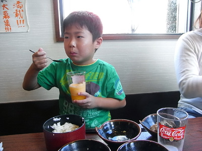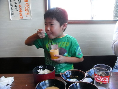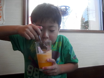 ドリンクバー! 長いこと水分制限されているSは、 ジュースが最高のご馳走なのである。 いつも十分に時間を掛けて吟味、 僅か底から1〜2cmだけついでくる。 |