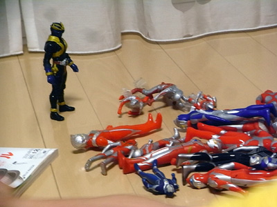 今日クリニックでゲットしたライダー。 (受診時、希望すると先生からオモチャを頂ける) いつも新入りが全員をぶちのめすのだ。 チナミに右下の黄色い物体が、 伏しているSのケツである。 |