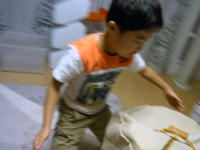 梱包材をつかって、ガブリ寄りの練習。 胸をつけんかい!胸を!! |
