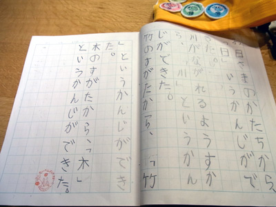 先生が黒板に書いた文章を、写す課題。 点や括弧でちゃんと1マス使ったり、 結構イケてるんじゃないか? そしてあのSが漢字を書いているのも驚き。 |