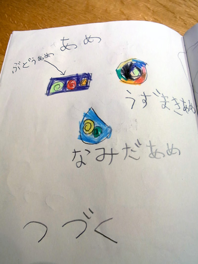 ちょっと前のSの落書き、 あめ(飴)シリーズ。 ぶどうあめ、 うずまきあめ、 なみだあめ。 つづく。 |