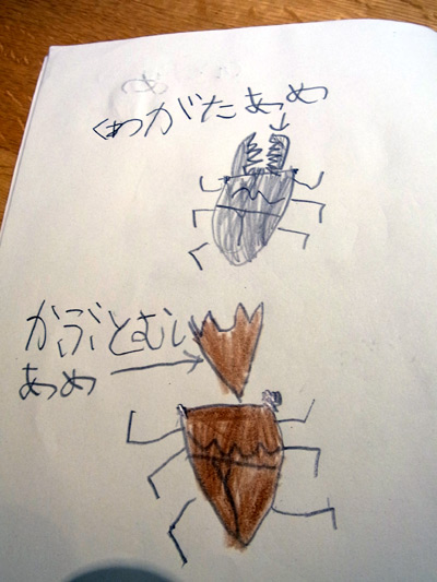 くわがたあめ、 かぶとむしあめ。 もう、飴のグルグル感は既にない。 |