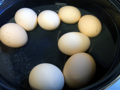 チナミに卵の下を少し割っておくと、 茹でた後に殻がスルッと剥ける。 |