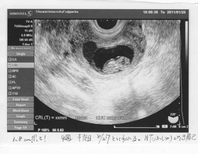 | Post note: 後頚部浮腫像(NT)は、妊娠10〜13週に現れ、14〜15週になると消失する。 その10〜13週に観察された際の浮腫の厚さが厚いほど、染色体異常や心臓疾患の危険率が上がると言われている。 とはいえ、正常である可能性の方が絶対的に高いんだけど・・・。 |