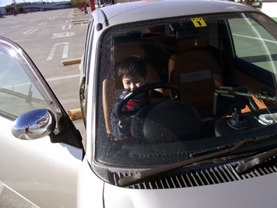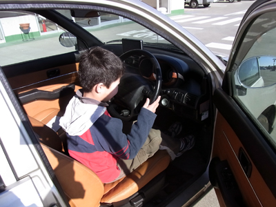なので運転席に座らせてやった。 アクセルとブレーキ、同時に踏んだらアカンて。 |