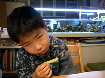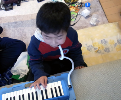 ピアニカ特訓。 今日は一発で弾けた! 体調が悪いので、どうなるかとヒヤヒヤだった。 パイプを左右の横でくわえる。 前歯がないからな。 |