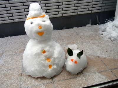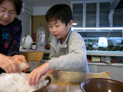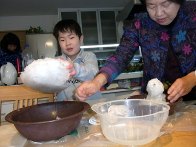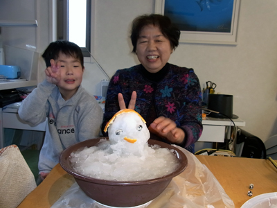 室内で雪達磨製作。 |