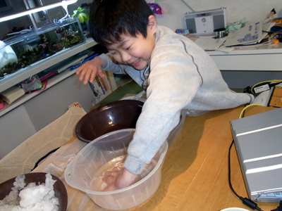 ぬるま湯で手を温めながら。 |