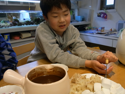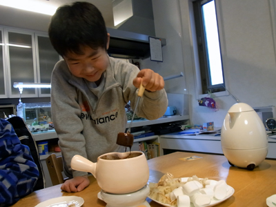 大好きなチョコも量が食べれないため、 視覚と触覚に訴えるフォンデュとしたのは、 おママのアイディア。 |