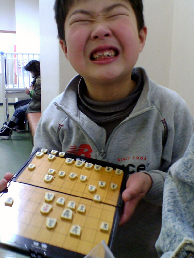 待ち時間も将棋勝負。 初めておパパに勝って、 嬉しさのあまり引きつり笑い。 |