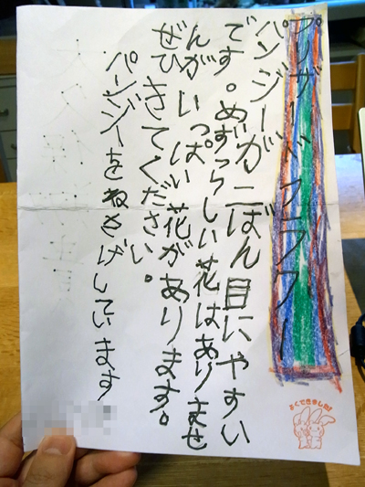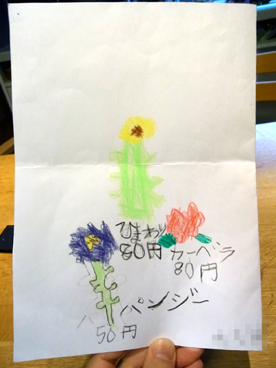 先日おママが行けなかった、小学校の親子レク。 Sは花屋をやったそう。 パンジーが二ばん目にやすいです・・・? Sはおかしな記載に今気が付いたようだ。 |