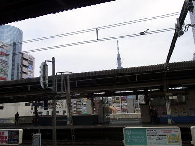 帰り道、Sが撮影したスカイツリー。 Sの身長からは先っぽしか見えない。 |