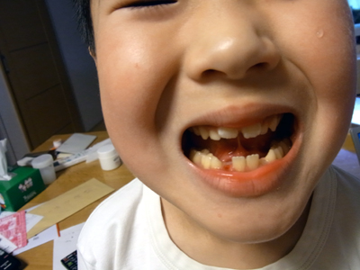 怖くて抜けなかった歯、 どうしても入学式の式典までに何とかしたくて、 イジッているウチに何とか抜けてくれた。 |