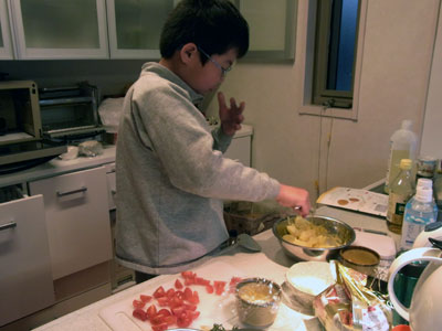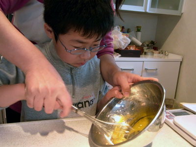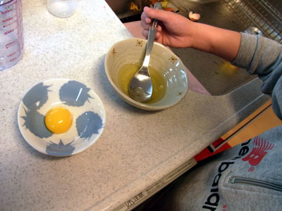で、核心のマヨネーズ作り。 分かれるはずの酢と油が混ざる不思議。 |