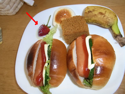 家で収穫したイチゴ1粒。 おママと縦切りの半分こ。 |