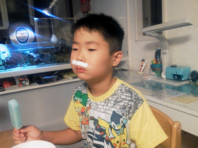 あまりにガリガリうるさいので、 風呂上がりにガリガリ君。 鼻のガーゼはとびひ再発の疑い。 |