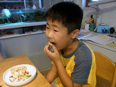 好物のピザを味わうの顔。 |