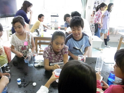 小学校の、文化祭(みたいなもの)。 スライム作りコーナーで、 大活躍だったそうだ。 |