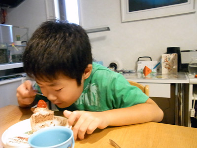 大好きなケーキをむさぼり食うS。 今年になって、 一切れを食べ尽くすことができるようになった。 |