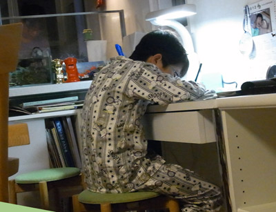 悪い姿勢。 鉛筆のおケツより目が近い。 4月に入れ換えた眼鏡の度数が、 もう既に弱くなっている。 |