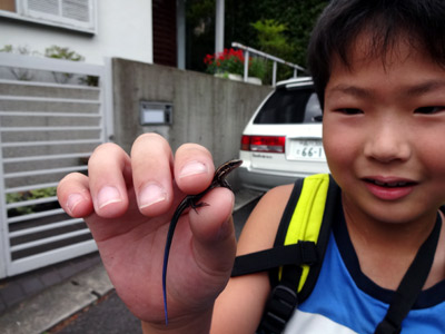 帰り道、Sがトカゲを捕まえた。 昔は全く追いつかなかったが・・・。 |
