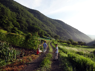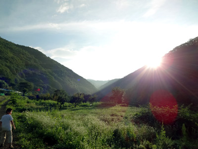 山裾から、太陽が昇ってきた。 陰と陽が、清々しい。 そうか、と思った。 長袖が必要だと言われていたとおり、気温が低い。 「夏はクーラーが要らない」という意味を、 やっと理解した。 |
