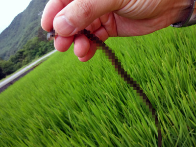 水田にカエルの姿はなかったが、 こんなヤツが居た。 千葉のおババ様が大の苦手とするので、 モザイクをかける。 |