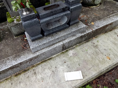 お供え物はなくなり、 線香の台まで飛ばされている。 本当に来たんだ、某かの動物が。 |