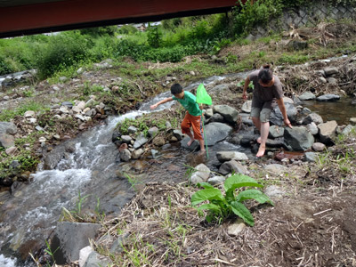 昨日の手づかみ会場の下流で。 逃げたのが釣れないかと目論んだが、 駄目だった。 |