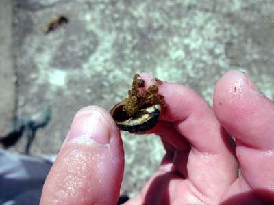 ヤドカリは出て逃げようとする。 こんなヤツは初めてだ。 |