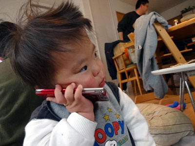 Sによじ登るH。 保育園では、誰かに寄っていくってことがないらしい。 |