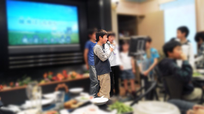 乾杯し、子供らはマイクに群がる。