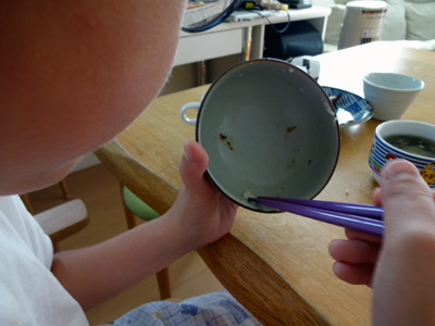 ご飯の食べ方、やればできるのに、 普段は点々と米が残る。 |