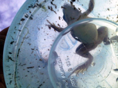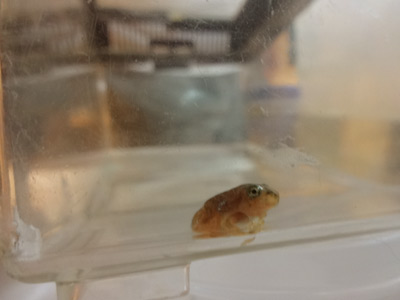 5月下旬「駅の向こうにある小さな沼」で捕まえた小さなオタマが上陸。 今週末帰そうな。 |