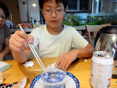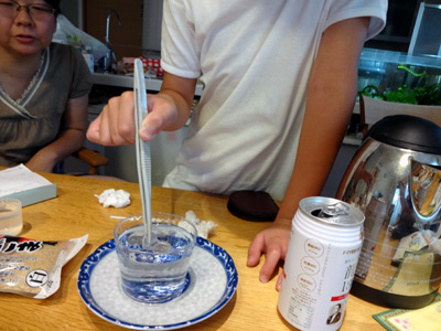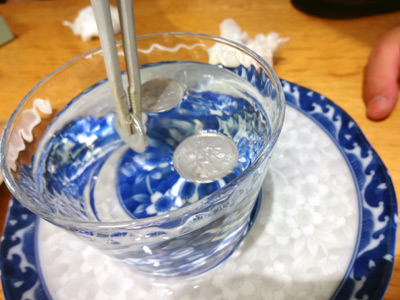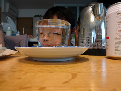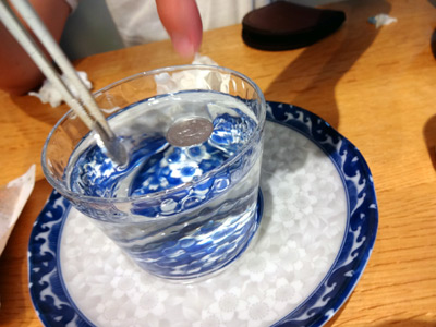 1円玉を浮かべる。 もう一枚の1円玉を近づけると・・・。 |