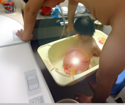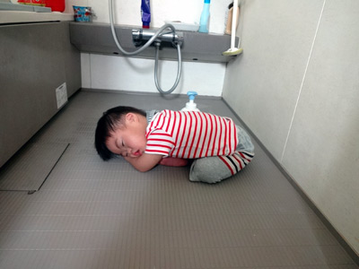 バスタブに湯は張っていないが、滅茶苦茶・ビショ濡れになるため急遽撤去に向かう。