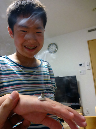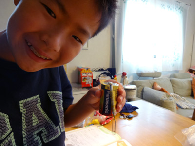 電池とエナメル線の接点を指で押さえていやがった・・・。