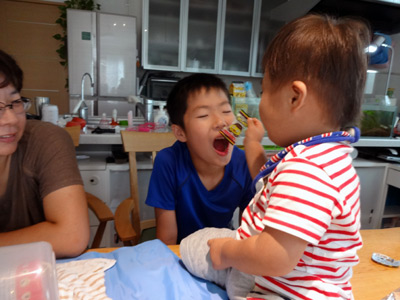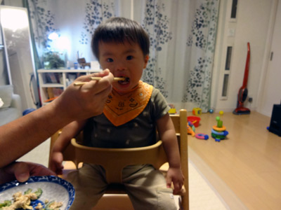 ![]() | Hは自分の乳児食よりも、みんなが食べてるものを欲しがる。 でもアンタさんが食べてるの、それ・・・。 |