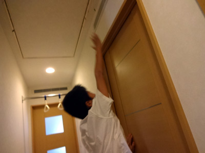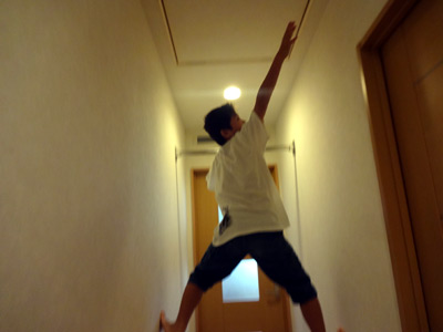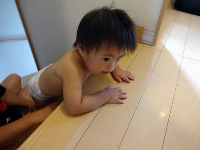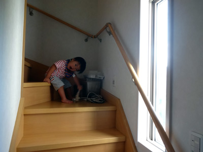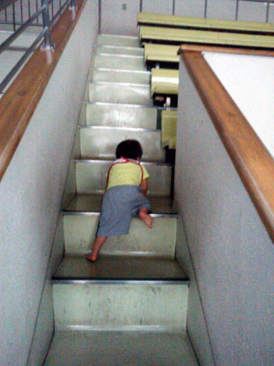 階段を降りる練習。 これやっとかないと、誤って転げ落ちる。 |