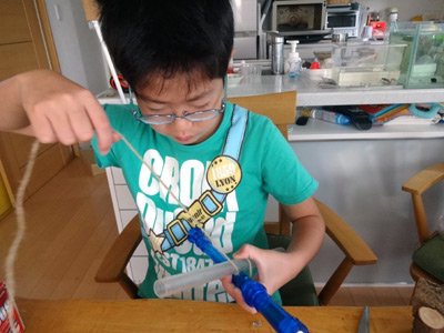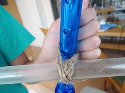 ホレ、どうすれば強く固定できる? 笛とパイプで練習だ。 |
