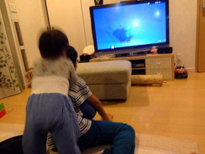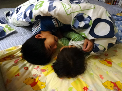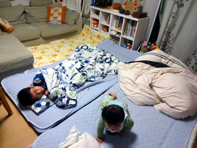 特にH、最近寝かしつけに耐性が生じている。 部屋を出て行かないと寝ないのだ。 |