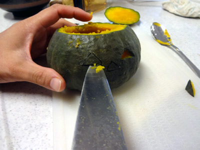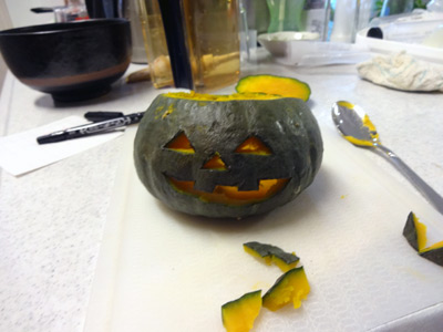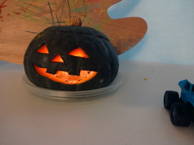 そしてカボチャが小さいと、脳天がろうそくで焦げる