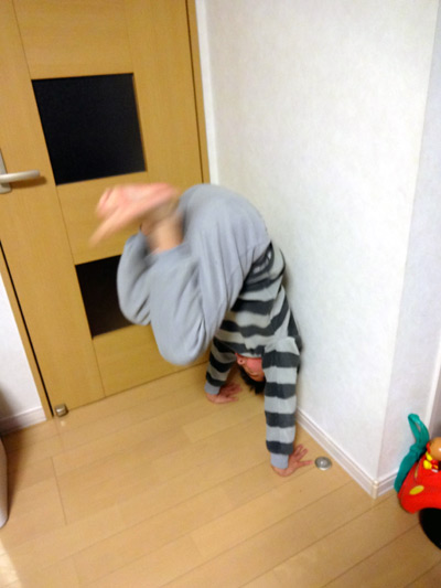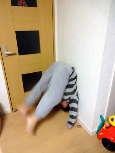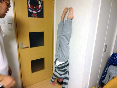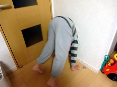 先日やった、壁にもたれる姿勢をやっている。 |