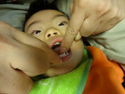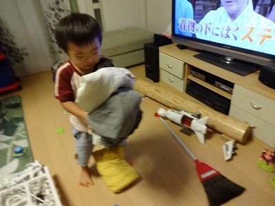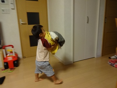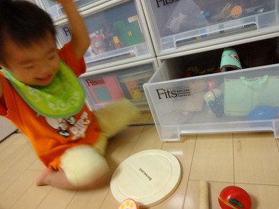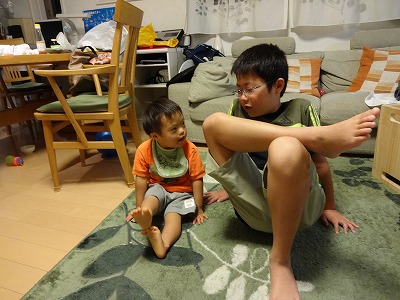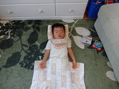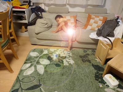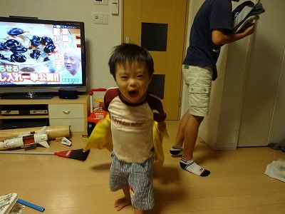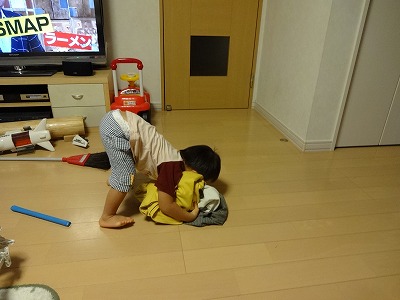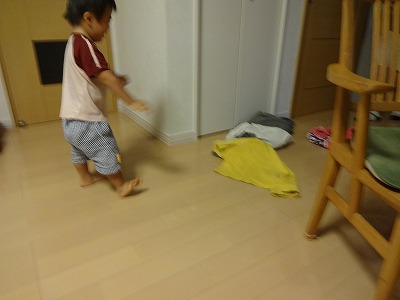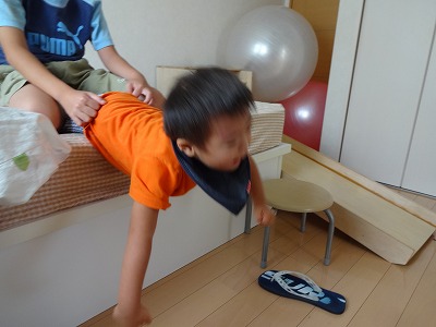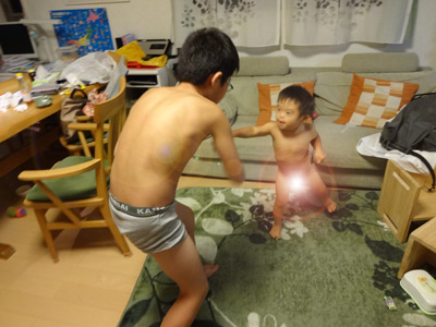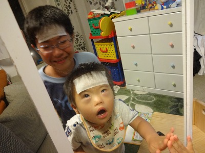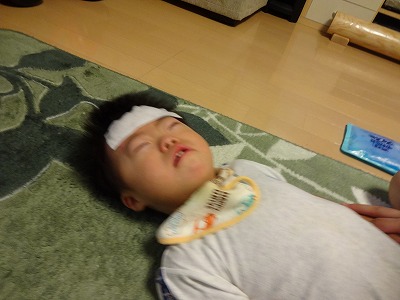 夜、Hがソファーから階段降り、勢い付き過ぎてそのまま転倒、デコが敷居の角に激突。