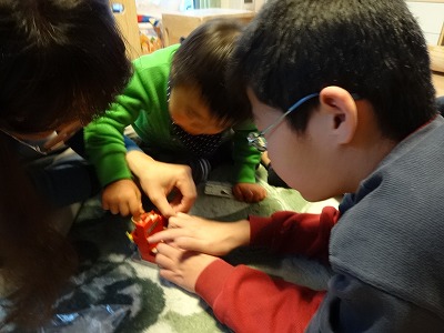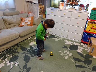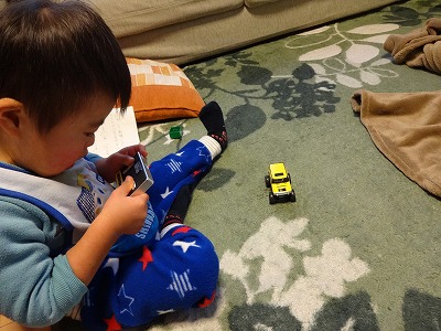Hには目と指先のトレーニングを兼ね、動きのあるトミカ系のおもちゃにした。